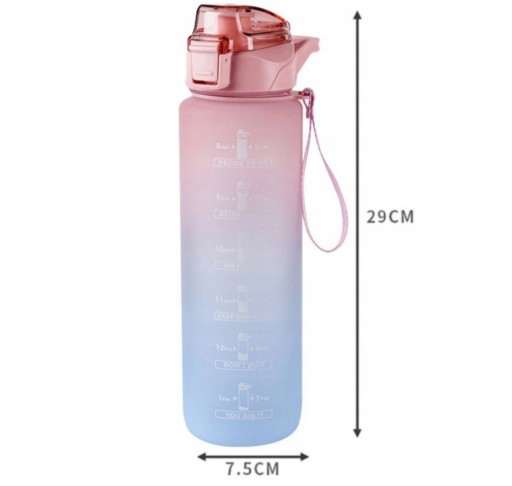 Bezpieczny materiał, duża pojemność i miarka motywacyjna to niewątpliwe atuty tej modnej butelki. Dzięki zamontowanej smyczy jest ona łatwa do przenoszenia, a zamontowana na stałe słomka umożliwia szybie i łatwe picie w każdych warunkach.