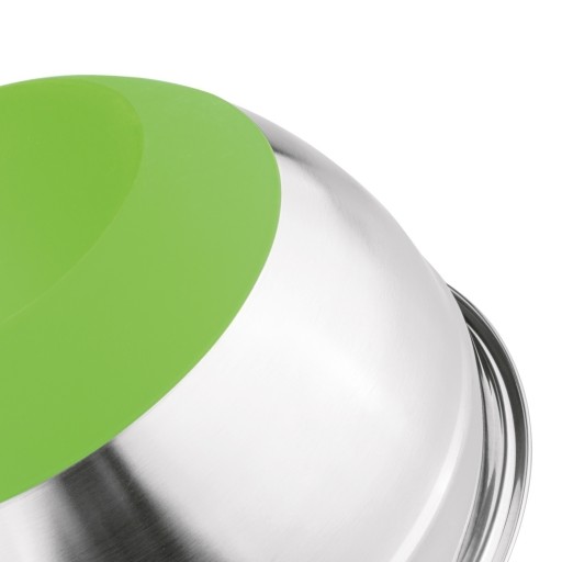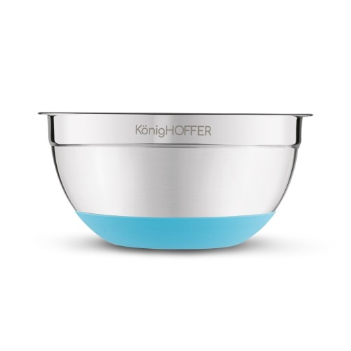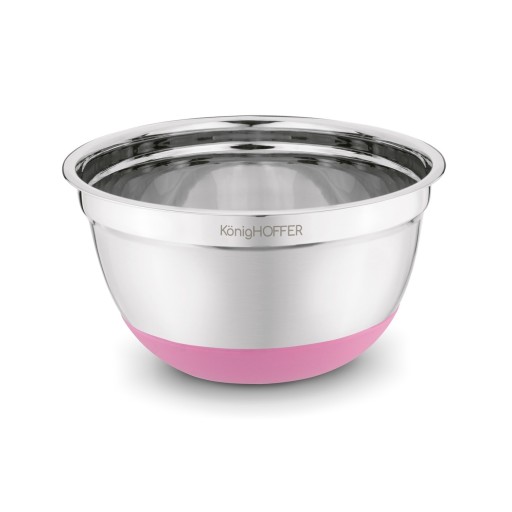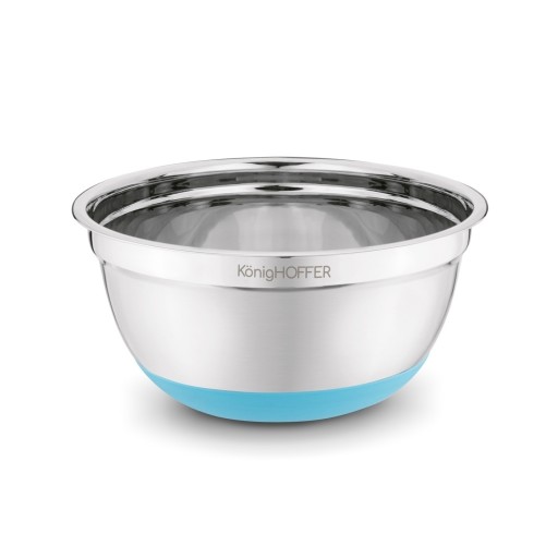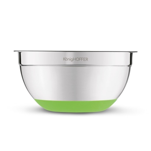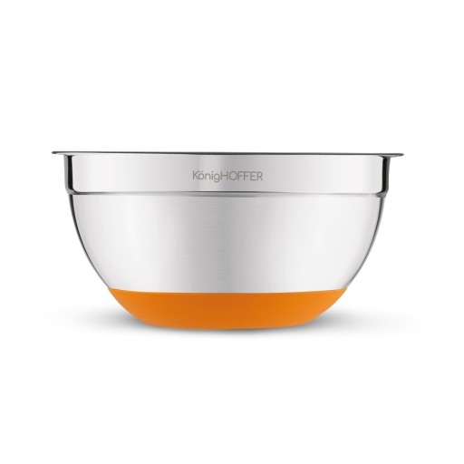 Metalowe miski Konighoffer 16 / 20 / 24 / 28 cm korzystają z podstawy pokrytej kolorowym silikonem. Dzięki niej naczynia nie ślizgają się podczas mieszania i stoją stabilnie na blacie podczas serwowania jedzenia. Zestaw pomoże ci w miksowaniu składników do wypieków. Zrobisz w nich ciasta i kremy tortowe, a nawet ubijesz śmietanę rózgą kuchenną. Wygodnie połączysz też składniki surówek, sałatek oraz na kotlety mielone. Miski ze stali nierdzewnej z silikonowym spodem Konighoffer mają pojemność 1 / 1,8 / 3,3 / 5,4 litra. Ich korpus jest z zewnątrz wykończony na wzór surowego, satynowanego metalu. Komplet zapewnia bezpieczeństwo dla składników spożywczych. Nie wpływa na smak oraz aromat, dlatego dobrze wesprze cię w przechowywaniu (nawet w lodówce). Miski zostały wykonane solidnie, więc zostaną w domowej kuchni na długie lata. Zaopatrzysz się w swój własny zestaw misek ze stali nierdzewnej, w pełni dostosowany do różnych wymagań i potrzeb.
