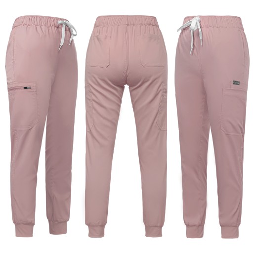 Spodnie medyczne mają średni stan i są regulowane troczkiem w pasie.