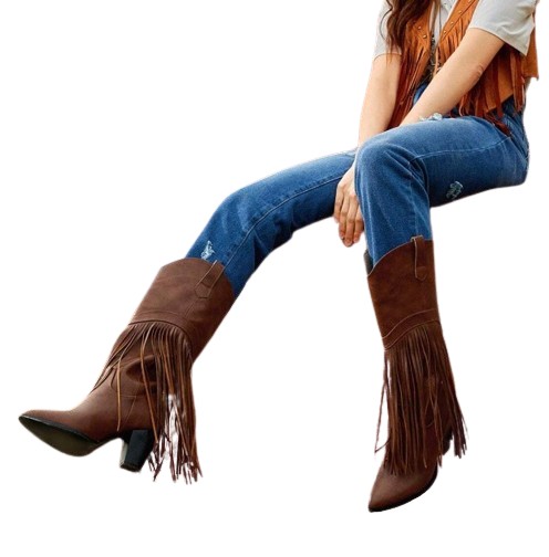 DAMSKIE BRĄZOWE KOZAKI KOWBOJKI FRĘDZLE