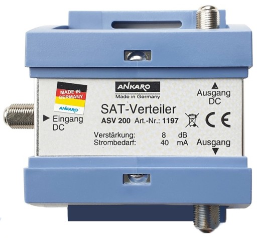 Rozgałęźnik 1/ 2 Ankaro ASV200, czyli 1 wejście, 2 wyjścia, pracuje w zakresie 950 MHz - 2300 MHz. Umożliwia podzielenie sygnału telewizji satelitarnej na dwa dekodery satelitarne. Współpracuje z systemem Unicable w instalacjach satelitarnych opartych o tego typu konwerter i umożliwia podział sygnału Unicable do dwóch dekoderów satelitarnych.