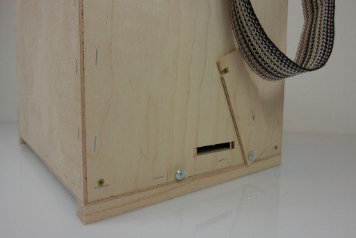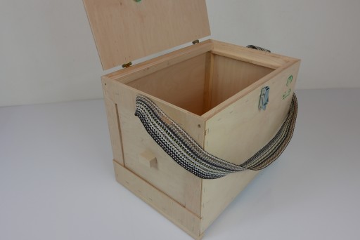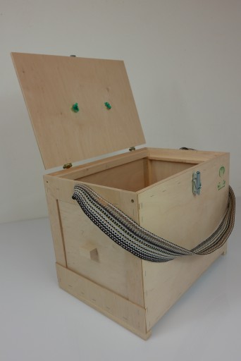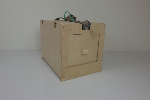 TRANSPORTÓWKA / ROJNICA na 7 ramek WIELKOPOLSKICH, wykonana solidnie na konstrukcji drewnianej, obita sklejką drewnianą, wieczko otwierane na zawiasy, jedna ze ścianek zrobiona z aluminiowej siatki (wentylacja) z klapką, na przeciwnej ściance zamykany wlotek pozwalający wykorzystać transportówkę jako tymczasowy „ul” dla rójek lub jako transportówka dla odkładów/pakietów. Posiada mały uchwyt w klapie oraz wygodny duży pasek na ramię. Pomocna w codziennej pracy przy przeglądach rodzin pszczelich oraz przy miodobraniu, niezastąpiona podczas łapania rójek.