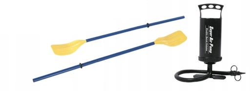 2 wiosła plastikowe, pompka, linka do chwytania dookoła pontonu (ok. 360 cm), uchwyty na wiosła, 2 uchwyty na wędkę, saszetka na drobiazgi, zestaw naprawczy.
