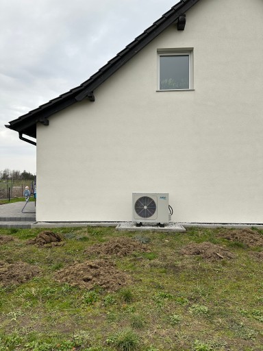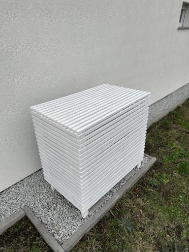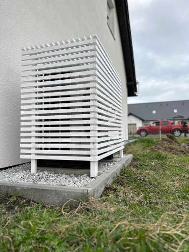Na zdjęciu biała osłona na pompę ciepła biała - projekt indywidualny.