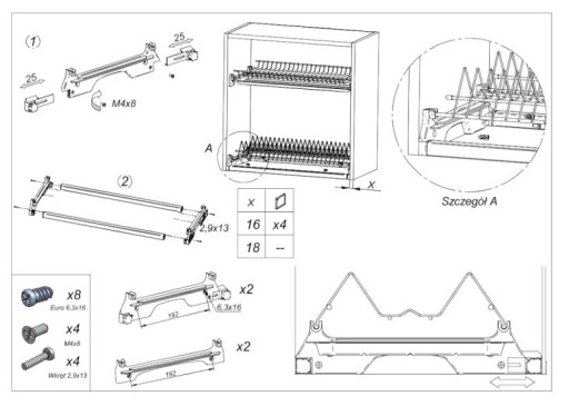 - Dolny stelaż z regulacją głębokości oraz zaczepem na plecówkę