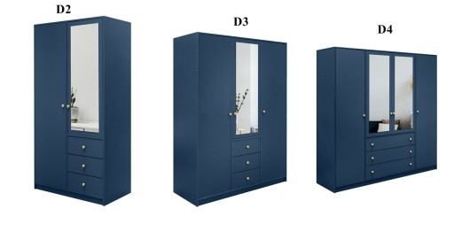 - szafa: drążek na wieszaki, trzy szuflady, półki, uchylne drzwi, lustro