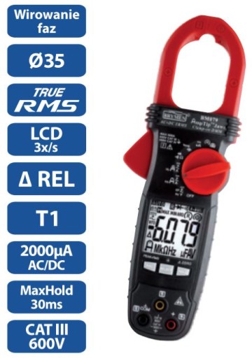 Mierniki cęgowe BM079 to seria mierników cęgowych AC/DC i AC mierzące rzeczywistą wartości skuteczną TrueRMS ACA i ACV posiadają funkcję AmpTip przeznaczoną do pomiaru cęgowego prądów do 60A w przewodach o niewielkiej średnicy - cęgi wyposażone są w specjalne wcięcie w górnej części; typową metodą cęgową zmierzymy prąd do 600A.
