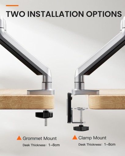 Łatwy montaż w 2 metodach – dzięki stabilnej konstrukcji i wysokiej jakości materiałowi ramion monitora na 2 monitory, nasz zacisk "C" (pasuje do biurka o grubości maks. 8 cm), podstawa przelotki (maksymalna grubość biurka wynosi 7 cm) i płyta VESA zapewniają najwyższą stabilność. To podwójne ramię monitora zapewnia mocne i stabilne połączenie z biurkiem i ekranem monitora. 2 różne metody montażu uchwytu na dwa monitory do różnych sytuacji instalacyjnych są bardzo bezpieczne dla biurka.