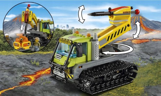 - Zawiera 3 minifigurki: kierowczynię pojazdu terenowego, miłośnika wulkanów i pracownika technicznego badającego wulkany.