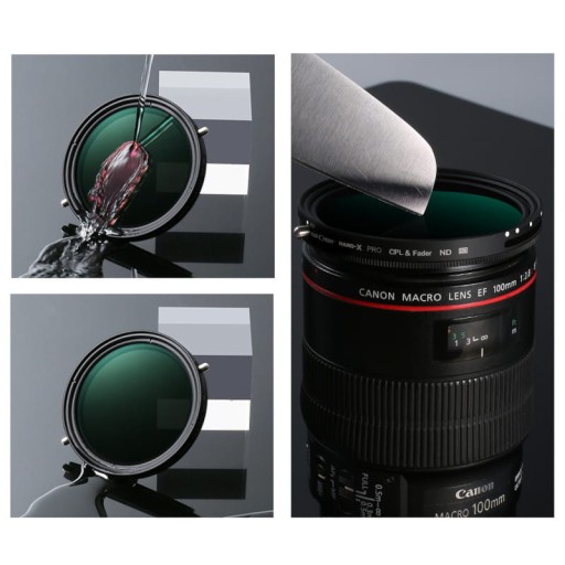 Filtr hybrydowy 2w1 K&F Concept serii Nano-X, łączący funkcje regulowanego filtra szarego typu fader oraz filtra polaryzacyjnego (CPL) - dwóch najpopularniejszych filtrów, znajdujących zastosowanie w fotografii przyrodniczej, krajobrazowej oraz produktowej. Specjalna konstrukcja umożliwia płynną i precyzyjną zmianę obydwu parametrów niezależnie od siebie. Filtr jest wykonany z wysokiej jakości szkła optycznego pokrytego licznymi warstwami antyrefleksyjnymi oraz ochronnymi, przekładającymi się na wysoką jakość rejestrowanego obrazu.