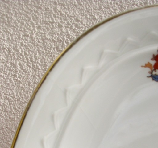Stan bardzo dobry poza włosowatym pęknięciem na kołnierzu, tego nie widać, nie ma żadnych odprysków, spokojnie można używać, ja właściwie dopiero zauważyłem na powiększonym zdjęciu, gdzieniegdzie delikatne przetarcie złocenia.