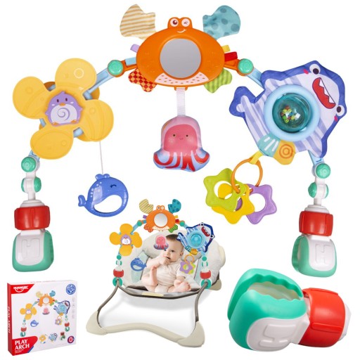 - 3 zabawki są zamocowane na pałąku