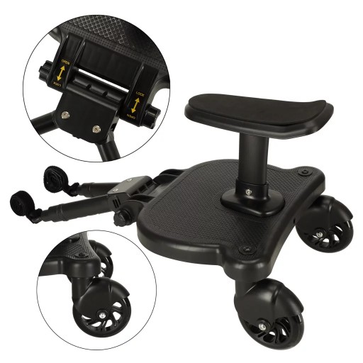 Dostawka do wózka jest wykonana z wytrzymałych materiałów, a jej maksymalne obciążenie wynosi 25 kilogramów. Montaż jest banalnie prosty i nie wymaga użycia żadnych narzędzi. Co więcej, dostawka pasuje do wózków od różnych producentów. A gdy maluch będzie chciał ponownie iść samodzielnie, dostawkę możesz zawiesić na wózku przy pomocy paska z zestawu.