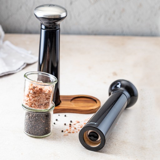 Zestaw młynków do pieprzu i soli wykonanych z drewna kauczukowego lakierowanego na kolor czarny. Młynki wyposażone w ceramiczny mechanizm mielący.