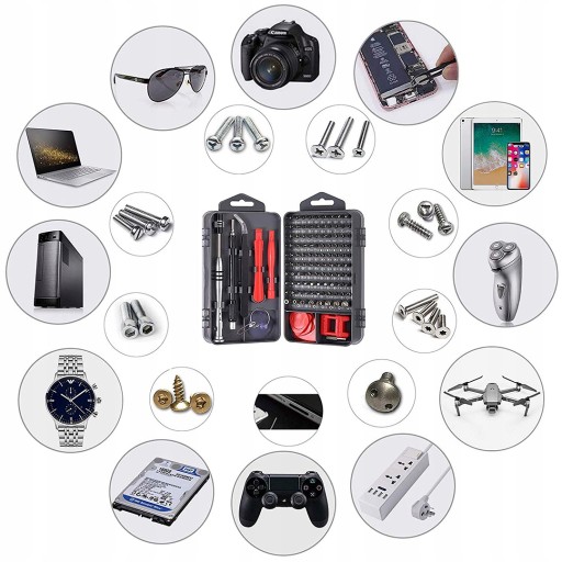 zestaw 115 precyzyjnych narzędzi, bitów i otwieraków z lekkim aluminiowym uchwytem przeznaczony do precyzyjnych napraw serwisowych telefonów i smartfonów w tym produktów marki Apple oraz wszelkiej elektroniki konsumenckiej.