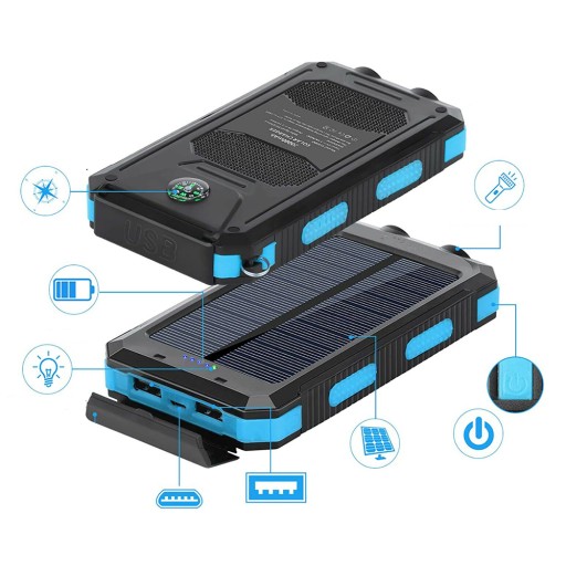 - Zasilany energią słoneczną: ten power bank z panelem słonecznym, który może stale ładować urządzenia przy silnym świetle.