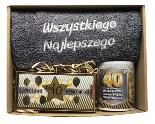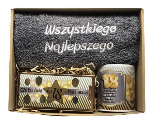 PREZENT NA URODZINY 18-60 Zestaw Kosz Prezentowy Ręcznik Kubek Czekolada