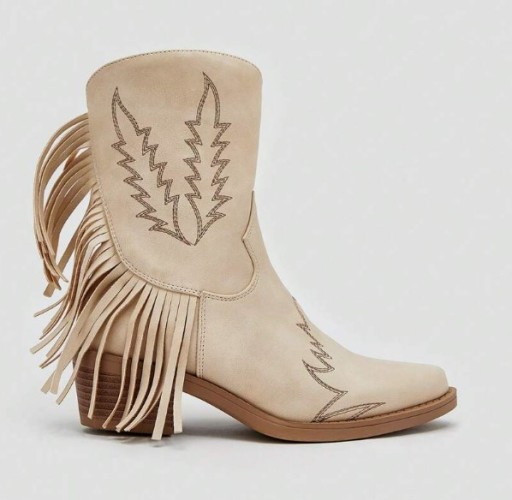 DAMSKIE BEŻOWE KOWBOJKI Z FRĘDZLAMI HAFT
