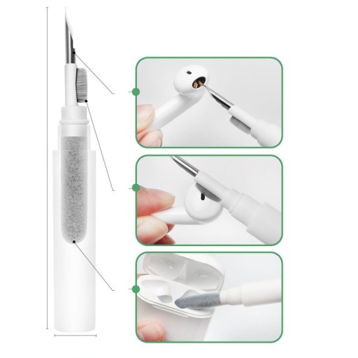 Produkt wyposażony jest w trzy różne rodzaje szczoteczek: dużą szczoteczkę, gąbkę pamięciową oraz małą szczoteczkę, które wspólnie zapewnią Ci kompleksową pielęgnację Twoich słuchawek.