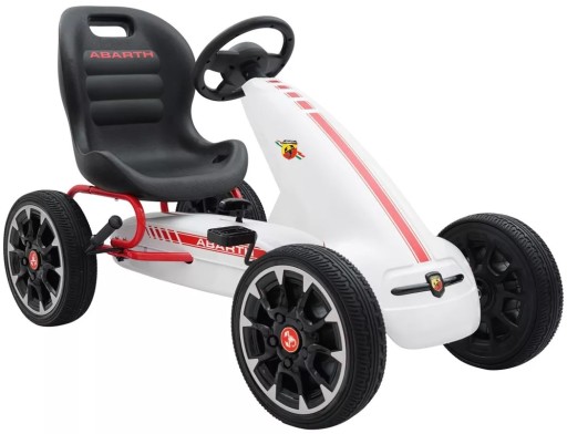 Gokart ABARTH White firmy Hecht wyposażony jest w gumowe koła oraz ręczny hamulec.