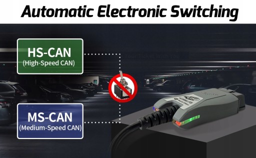 - Automatyczny przełącznik elektroniczny: Automatyczne przełączanie HS CAN / MS CAN. Obsługa wszystkich protokołów OBD2.