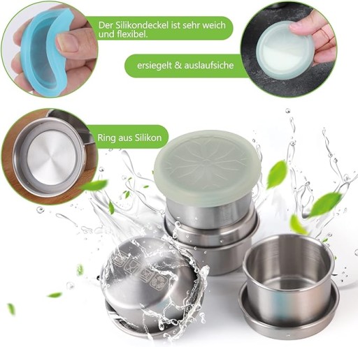 - Pojemniki zawierają dwa rodzaje pokrywek (stal nierdzewna i silikon, obie są w 100% hermetyczne). Pokrywki ze stali nierdzewnej są z reguły trudne do otwarcia, aby utrzymać pojemniki hermetyczne. Dlatego zalecamy stosowanie silikonowych pokrywek, które można łatwo otworzyć, gdy dzieci są w zabawie.