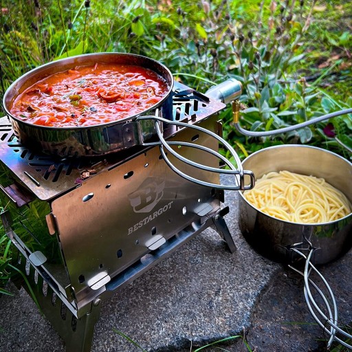 Do gotowania, serwowania, przechowywania – wszystko w jednym zestawie do gotowania. Pokrywa może służyć również jako talerz. Garnki i patelnie kempingowe ze stali nierdzewnej do smażenia i gotowania wszelkich potraw. Warzywa i mięso zachowują bardzo mocny smak.