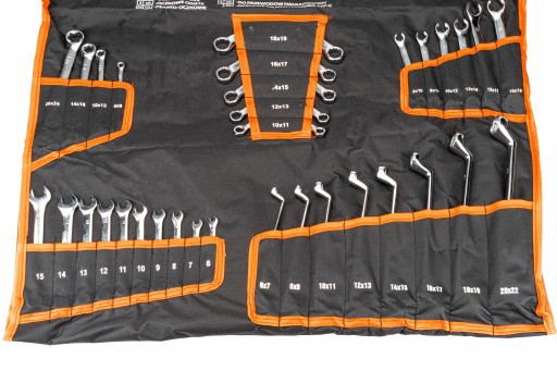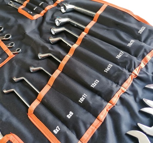 - Zestaw 47 kluczy zapakowany jest w wygodne zwijane etui dzięki czemu zajmuje mało miejsca ( etui zapinane na rzepy ).