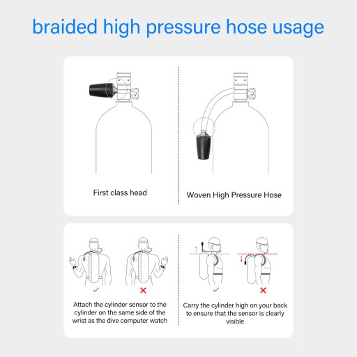 1. WĄŻ WYSOKIEGO CIŚNIENIA: Wąż regulatora wysokiego ciśnienia do nurkowania jest wykonany z tkanego włókna węglowego, zapewniającego doskonałą odporność na ciśnienie i ścieranie, aby zapewnić bezpieczeństwo podczas długich nurkowań.