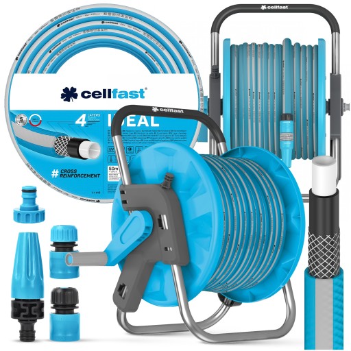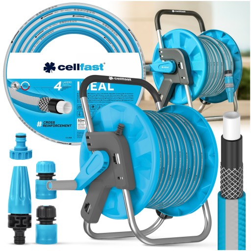 Wąż ogrodowy IDEAL na stojaku ALUPLUS z zestawem zraszającym BASIC Cellfast