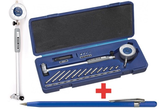 Do precyzyjnych pomiarów średnic wewnętrznych i szczelin. Wyposażony w wymienne trzpienie pomiarowe i podkładki dystansowe o różnych rozmiarach. Sprężynujący mechanizm końcówki zapewnia samoczynne centrowanie, a wierzchołek pomiarowy ma pokrycie z węglików spiekanych. W komplecie z czujnikiem zegarowym. Dokładność ± 15 µm plus dokładność czujnika zegarowego wg DIN 878. Umożliwia pomiar otworów nieprzelotowych przy dnie.