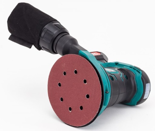 Szlifierka posiada system odsysający pył z workiem – talerz podporowy z wieloma otworami pozwala na skuteczne odsysanie pyłu.