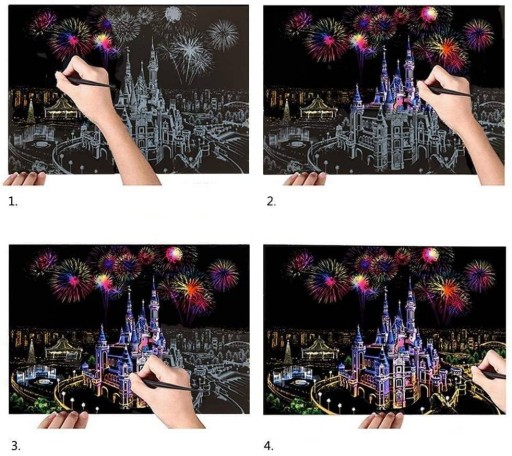 - zdrapywaniu górnej warstwy czarnej farby specjalnym rysikiem, w zaznaczonych miejscach na arkuszach - co pozwala na stopniowe odsłanianie pięknego, ukrytego rysunku.