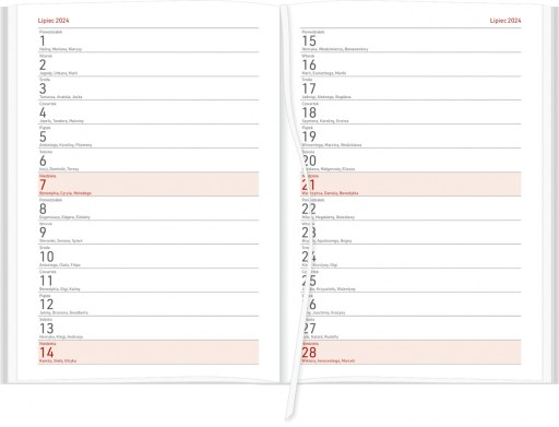 - kalendarium od 01.07.2024 do 24.08.2025 (lipiec i sierpień w układzie 2 tygodnie na 1 stronie, pozostałe miesiące w układzie tygodniowym - 1 tydzień na 2 sąsiednich stronach)