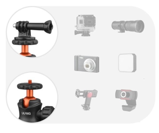 Głowica idealnie nadaje się do mocowania kamer sportowych i telefonów komórkowych. Aby zamocować telefon należy zastosować dodatkowy, standardowy uchwyt na gwint 1/4''. Z kolei do zamocowania kamery sportowej niezbędne elementy znajdziemy w zestawie.