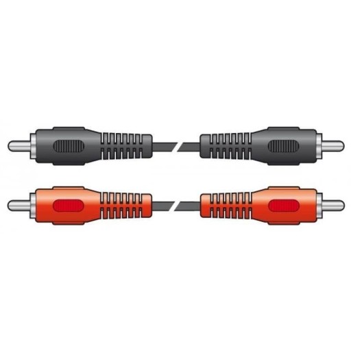 Dwa wtyki RCA phono na dwa wtyki RCA z ekranowanym podwójnym kablem audio, kodowane kolorami dla połączenia stereo.