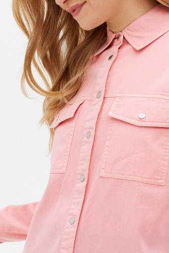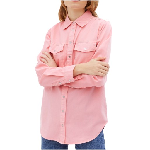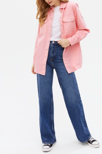 Nowa Jeansowa koszula firmy New Look w odcieniu pudrowego różu. Zapinana z przodu na zatrzaski. Koszula posiada kołnierzyk oraz dwie kieszenie z przodu na zatrzask. Na długi rękaw. Mankiety na zatrzask. Model Jasmi, oversize (luźny).