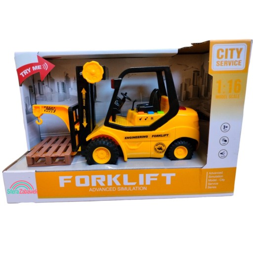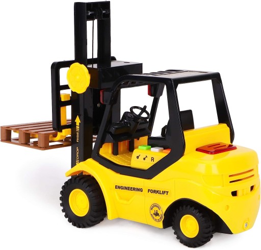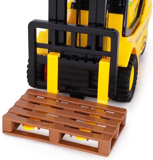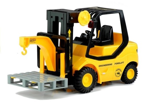 Zabawka utrzymana w kolorystyce żółto-czarnej, przypominającej prawdziwe pojazdy budowlane, zaskakuje dbałością o detale. Na desce rozdzielczej znajdują się kierownica, symulacje wskaźników i drążek zmiany biegów, a otwarta kabina operatora dodaje realizmu. Wózek porusza się za pomocą napędu frykcyjnego - wystarczy pociągnąć go do tyłu, by rozpocząć zabawę. Dodatkowo, wyposażony jest w przyciski odpowiadające za odpalanie silnika, klakson i sygnał cofania. Widły można regulować manualnie za pomocą korbki, co zwiększa możliwości zabawy.
