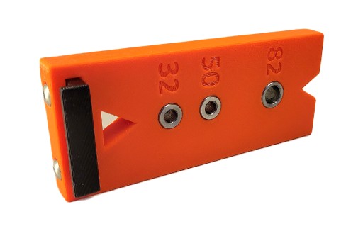 Szablon do wykonywania wierceń połączeń mimośrodowych o długości trzpienia 34 lub 44mm i mimośrodu fi15mm. Przyrząd do płyty 18mm. Możliwość stosowania z innymi grubościami płyty (po wykonaniu odwiertu na mimośród należy odwrócić formatkę i wywiercić otwory na kołek i trzpień fi8mm w wieńcu), co zapewnia równe licowanie materiału.