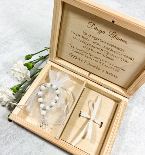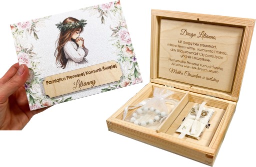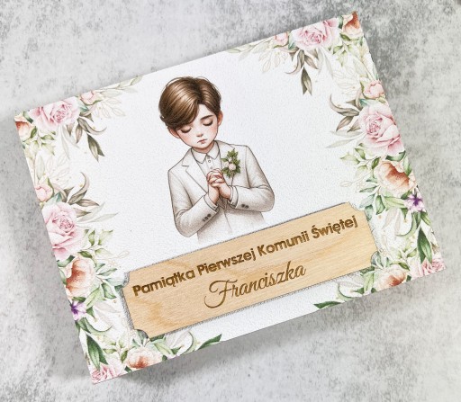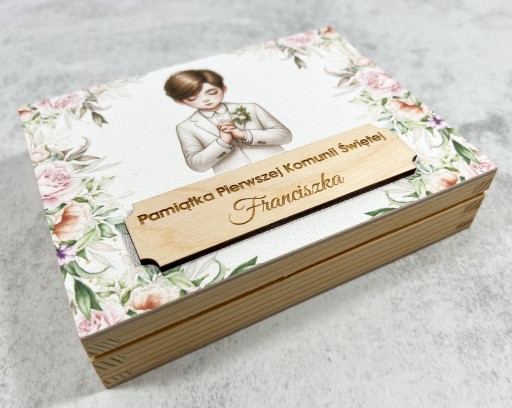 Drewniane pudełko na pieniądze - pamiątka I Komunii Świętej