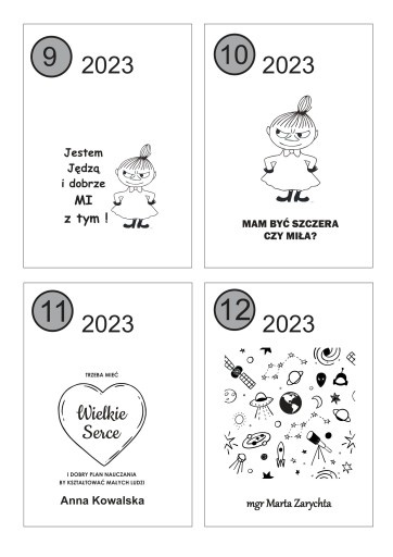- planer na rok szkolny 2024/2025 (od lipca 2024 do października 2025) - kolejne miesiące roku szkolnego w kolumnach z miejscem na notatki przy każdym dniu