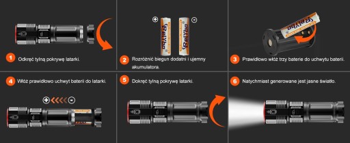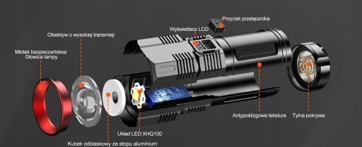 - ✔️Obudowa latarki wykonana jest z aluminium lotniczego i jest odporna na mróz, zarysowania, wstrząsy i uderzenia. Jest zbudowany jak czołg, dzięki czemu można pracować w każdych trudnych warunkach bez żadnych problemów.