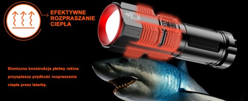 - ✔️Nie musisz martwić się o rozpraszanie ciepła. Ultrajasna latarka A11 wykorzystuje biomimetyczną konstrukcję płetwy rekina, która może przyspieszyć rozpraszanie ciepła latarki.