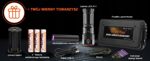 - ✔️Zestaw latarki zawiera: Latarka A11 50000 lumenów *1, akumulator (4000 mAh) *3, kabel ładujący USB-C *1, latarka z czarnym światłem *1, smycz *1, instrukcja obsługi *1 i pudełko upominkowe *1.