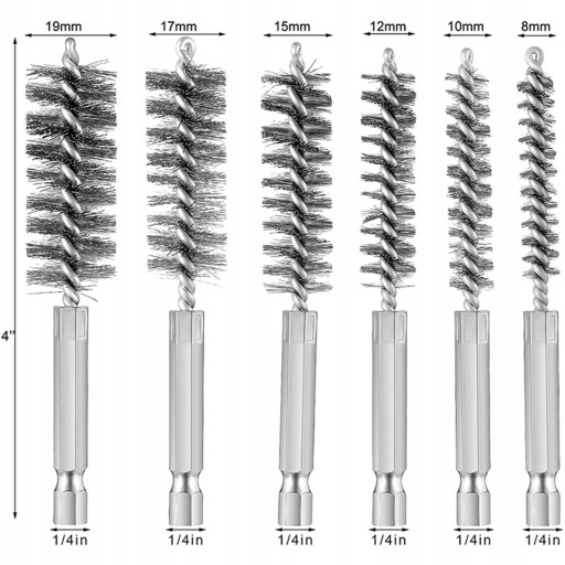 Każda szczotka ma 4 cale długości i 1/4 cala do zamontowania na dowolnej szlifierce (brak w zestawie).