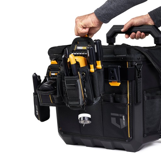 - Materiał okalający torbę to wzmocniona tkanina o gęstości 1680 denier, co zapewnia dodatkową ochronę przed przetarciami i uszkodzeniami. Na przedniej części torby znajduje się klips ClipTech, który umożliwia zawieszenie innych toreb ToughBuilt z systemem ClipTech. Dzięki temu można jeszcze lepiej zorganizować miejsce pracy i ułatwić transportowanie różnych narzędzi.