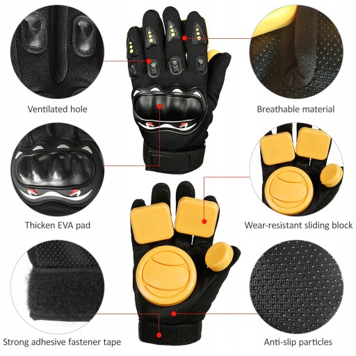 Come with 4 removable sliding blocks on palm and fingers. There are armor and thick EVA pad on the back, protect your finger joint and the back of hand in the friction. Breathable fabric and ventilate holes for great ventilation and heat dissipation, keep the palm dry and stress free. Adjustable adhesive fastener tape offers superior wrist-support and a comfortable fit.