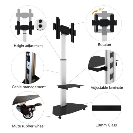 - Akcesoria w zestawie: Uchwyt do telewizora Kolumna Podstawa ze szkła hartowanego z 4 kołami Półka ze szkła hartowanego na sprzęt A/V Akcesoria instalacyjne Instrukcja obsługi