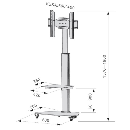 - Wymiary: Podstawa: 800 x 500 mm Kolumna teleskopowa: 1370-1900 mm Półka: 420 x 350 mm