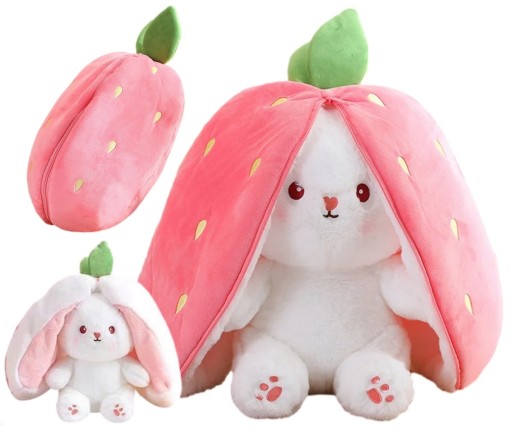 Nasza maskotka to nie tylko zwykły królik. Jest to też Królik Truskawka lub poduszeczka Truskawka. Teraz dzięki jednej maskotce Twoje dziecko może bawić się na trzy sposoby.